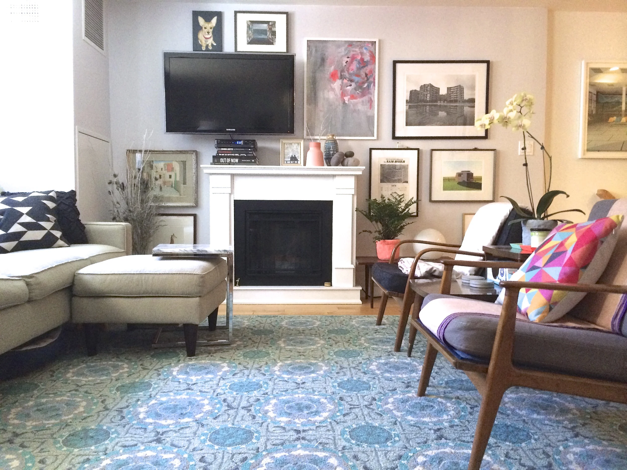 as you may or may not know, we recently had a leak in our living room that damaged the floors. this necessitated a move, plumbers, hvac technicians, and finally, new maple planks. after weeks (unbearably long when you are already very pregnant and wanting to hang nursery prints rather than deal with stripped concrete floors), we are finally moving everything back this week. hhh and i contemplated a new arrangement for the living room, but i'm not totally sold on it. here are some photos: